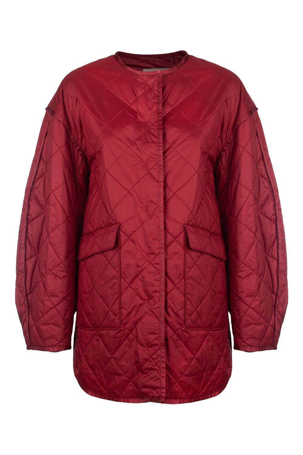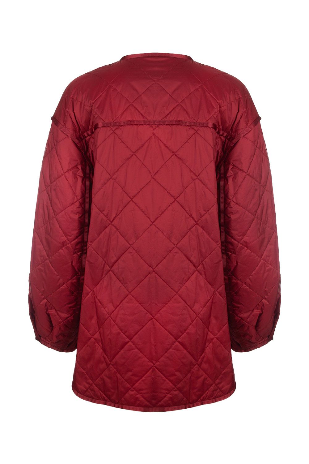 Piumino rosso imbottito in Luxepad di cachemire con apertura frontale con bottoni automatici, maniche lunghe balloon e tasche con patta applicate nella parte frontale