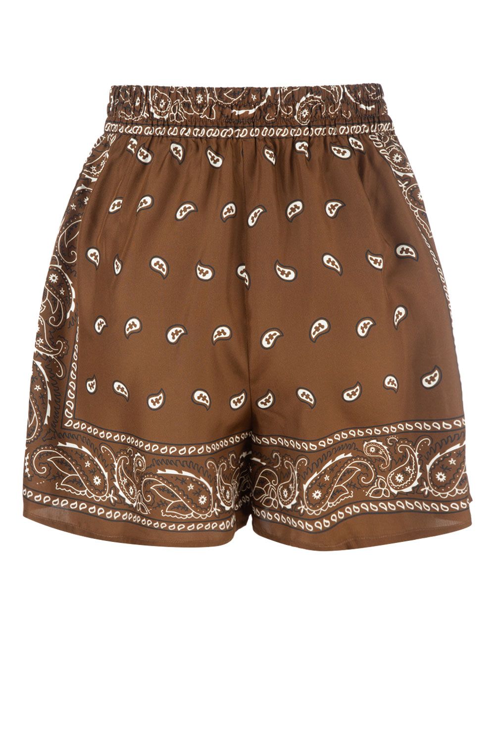 Shorts pigiama in twill di seta marrone stampa bandana con vita elasticata con coulisse e tasche laterali