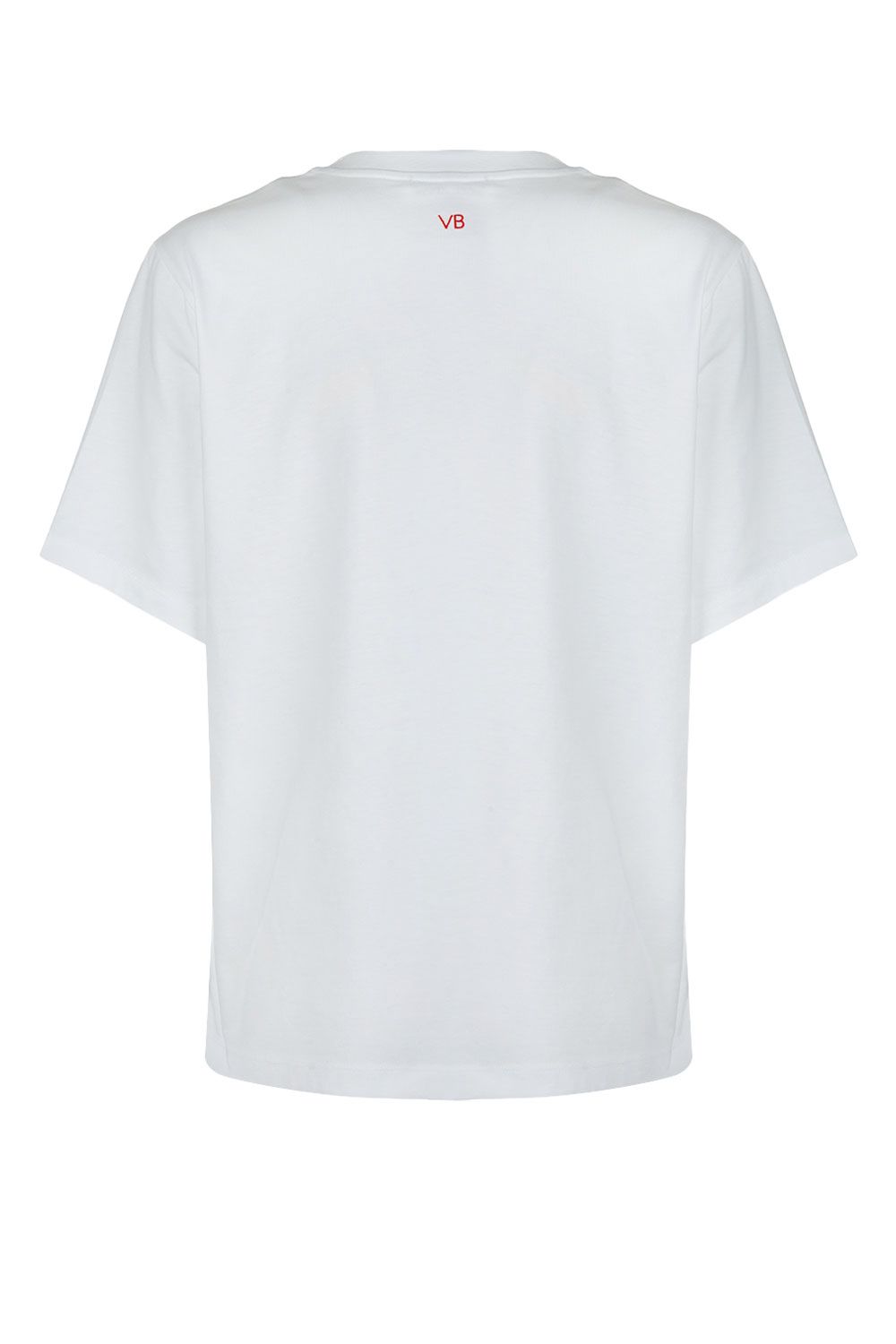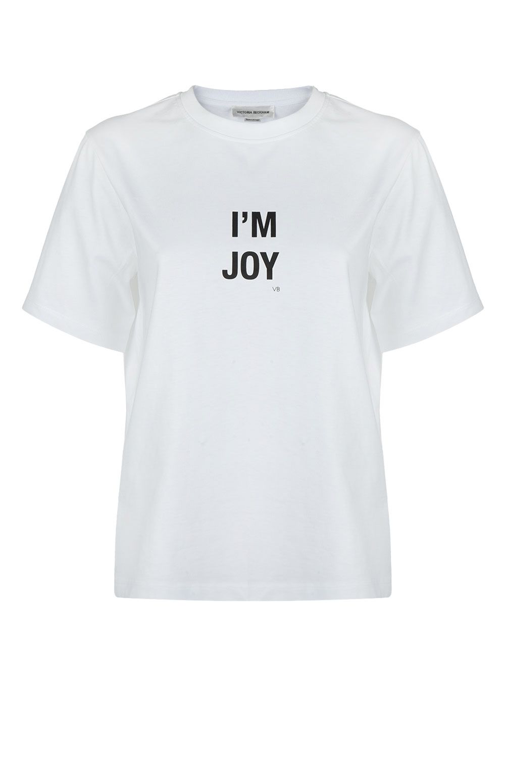 T-shirt girocollo in cotone bianca con scritta nera “I’M JOY” e logo “VB”,