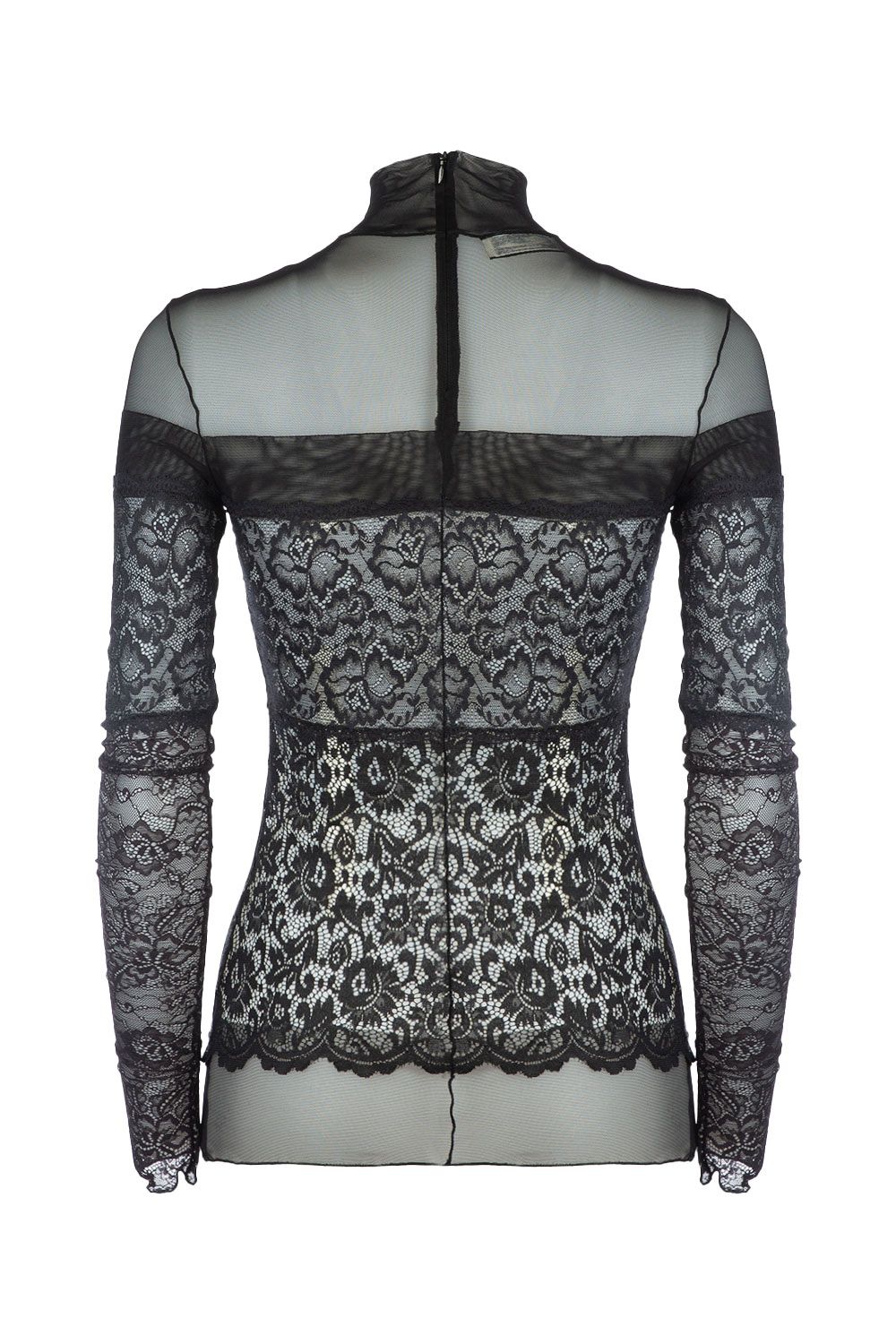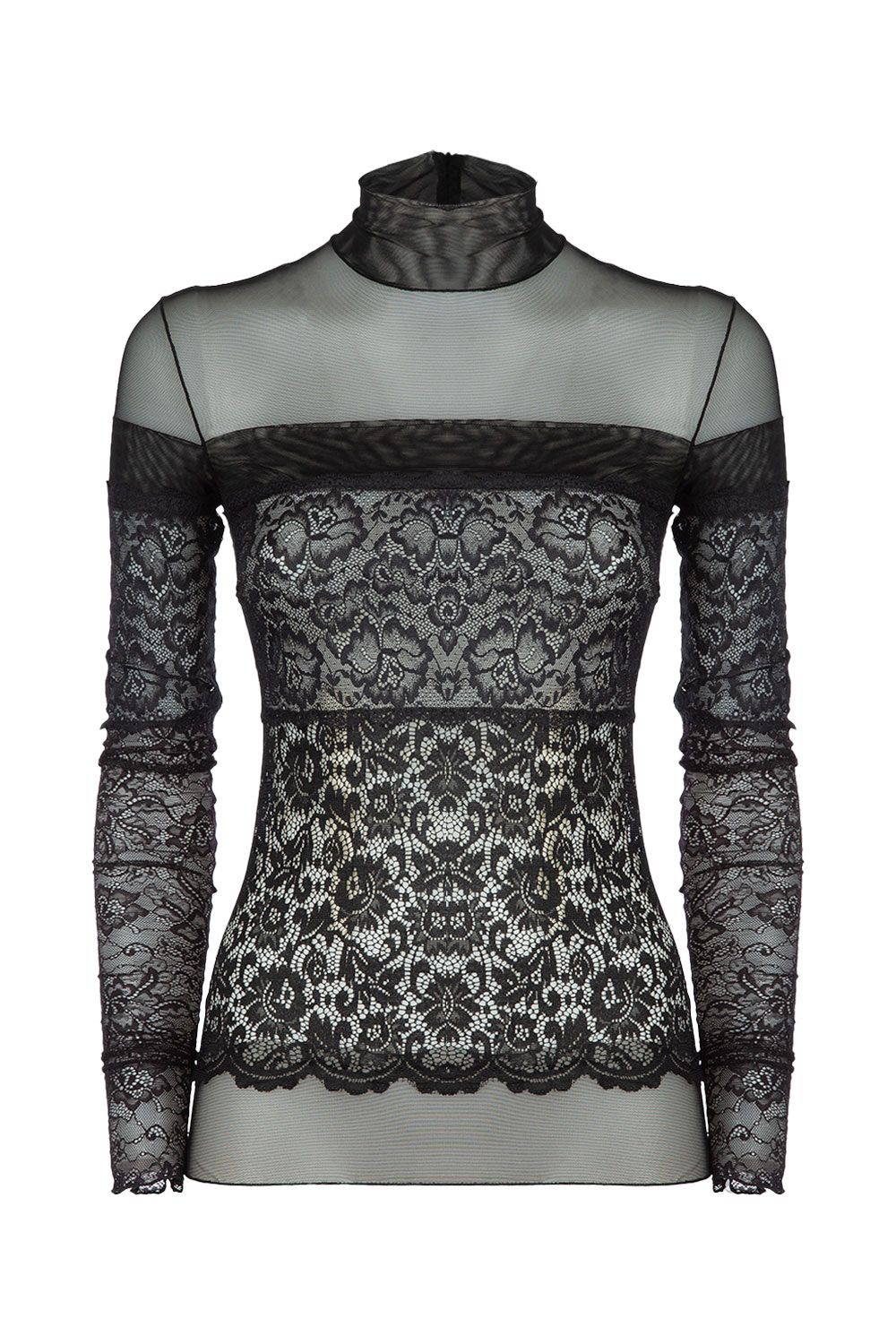 Top dolcevita in pizzo e tulle stretch semitrasparente nera con manica lunga, chiusura con zip a scomparsa sul retro