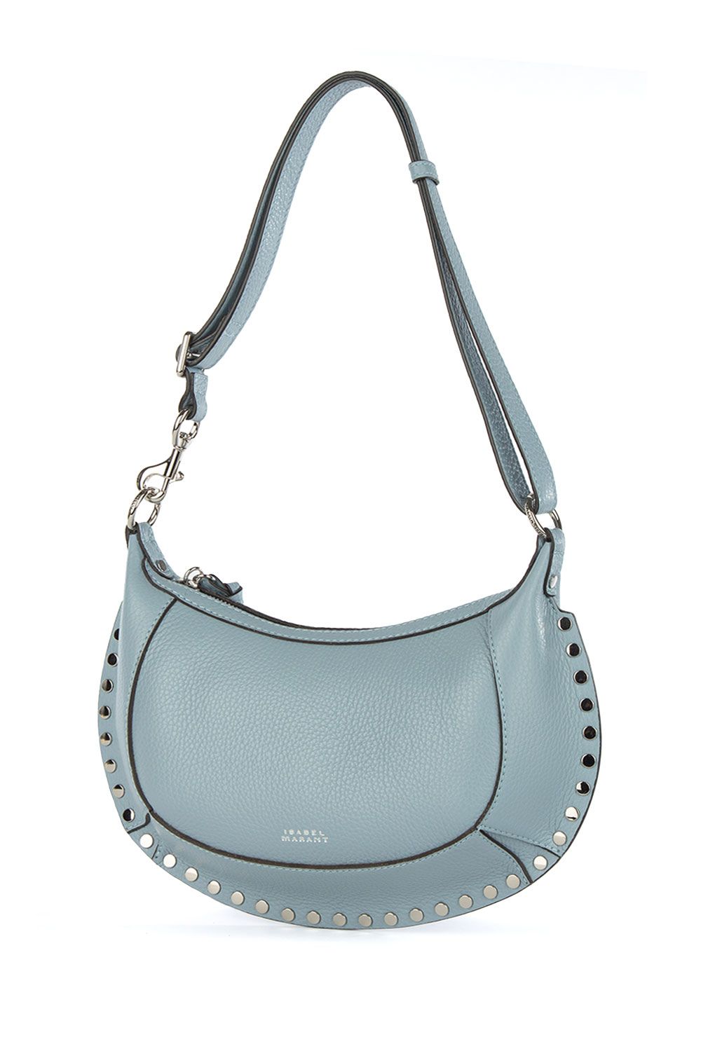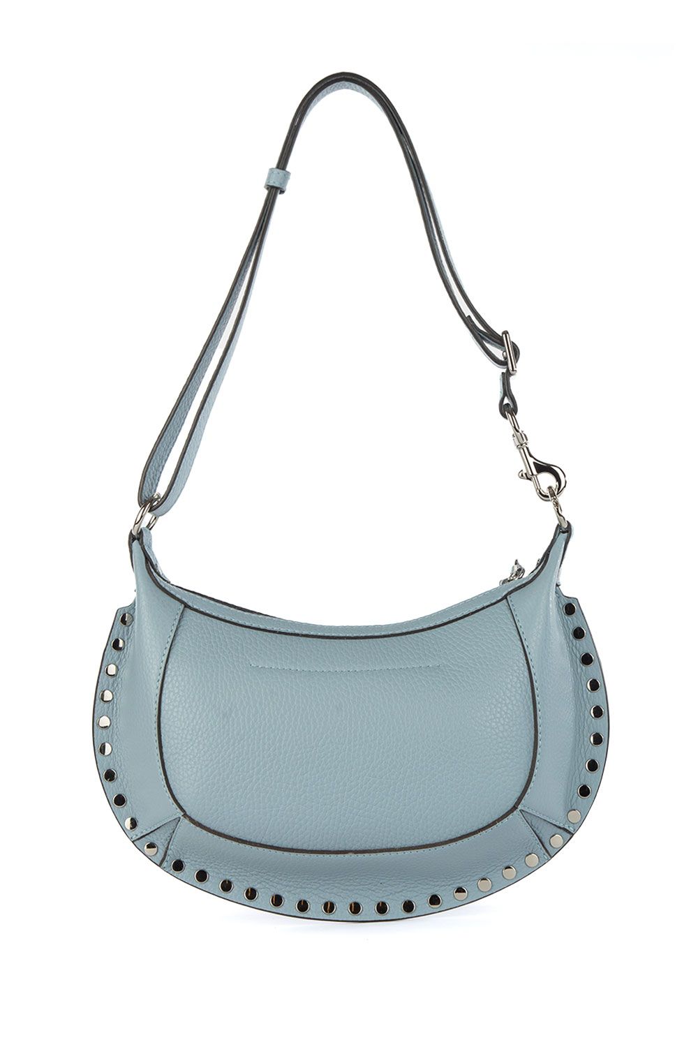 Borsa a spalla in pelle martellata azzurra con manico in pelle regolabile, apertura con zip nella parte superiore e bordo decorato con borchie