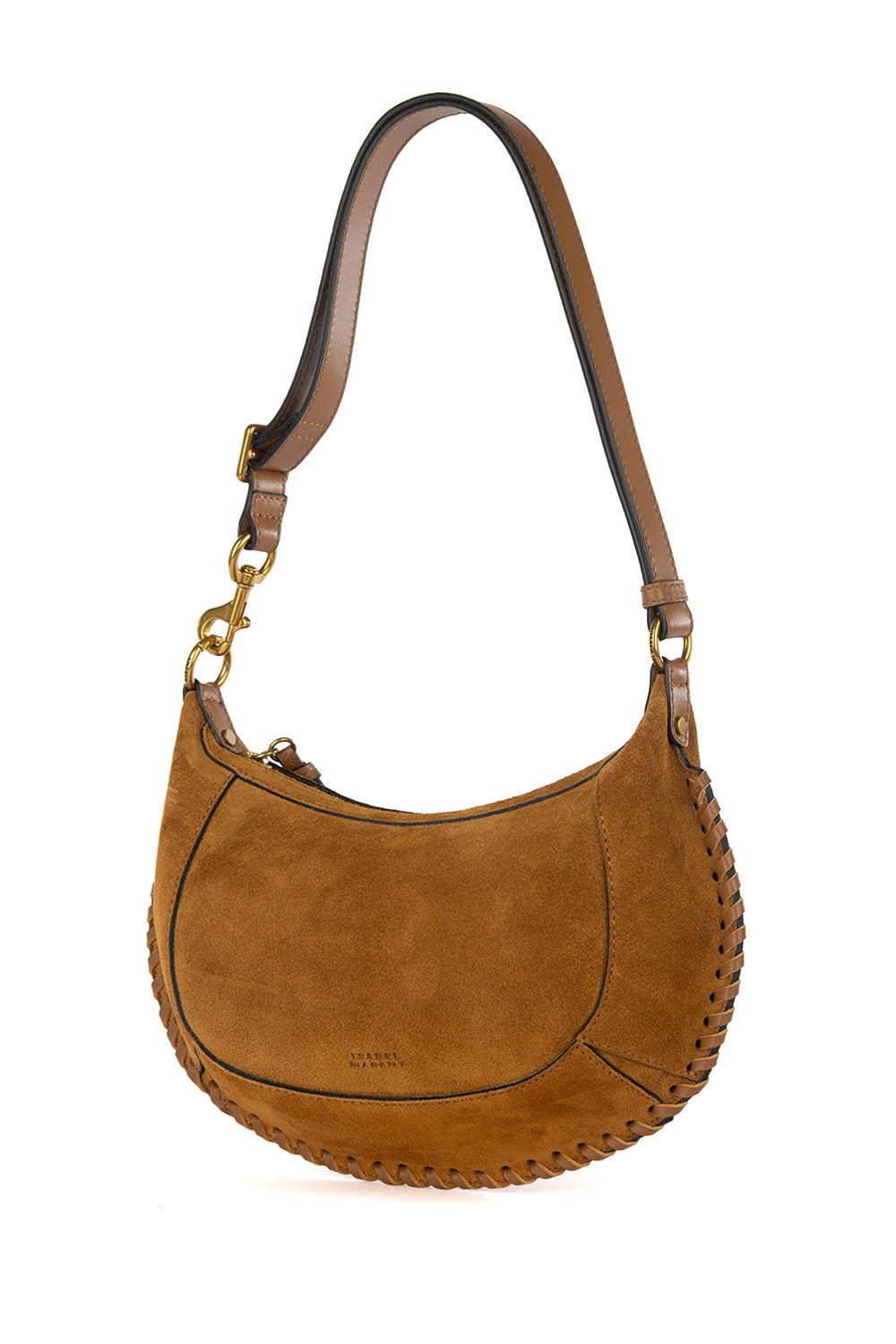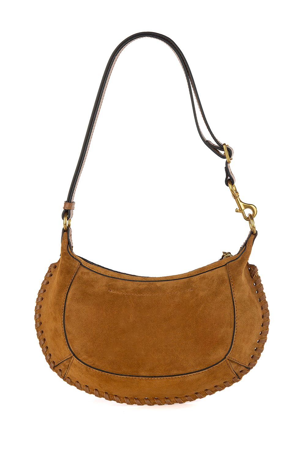Borsa a spalla in suede cognac con manico in pelle regolabile, apertura con zip nella parte superiore e bordo decorato con intreccio in pelle