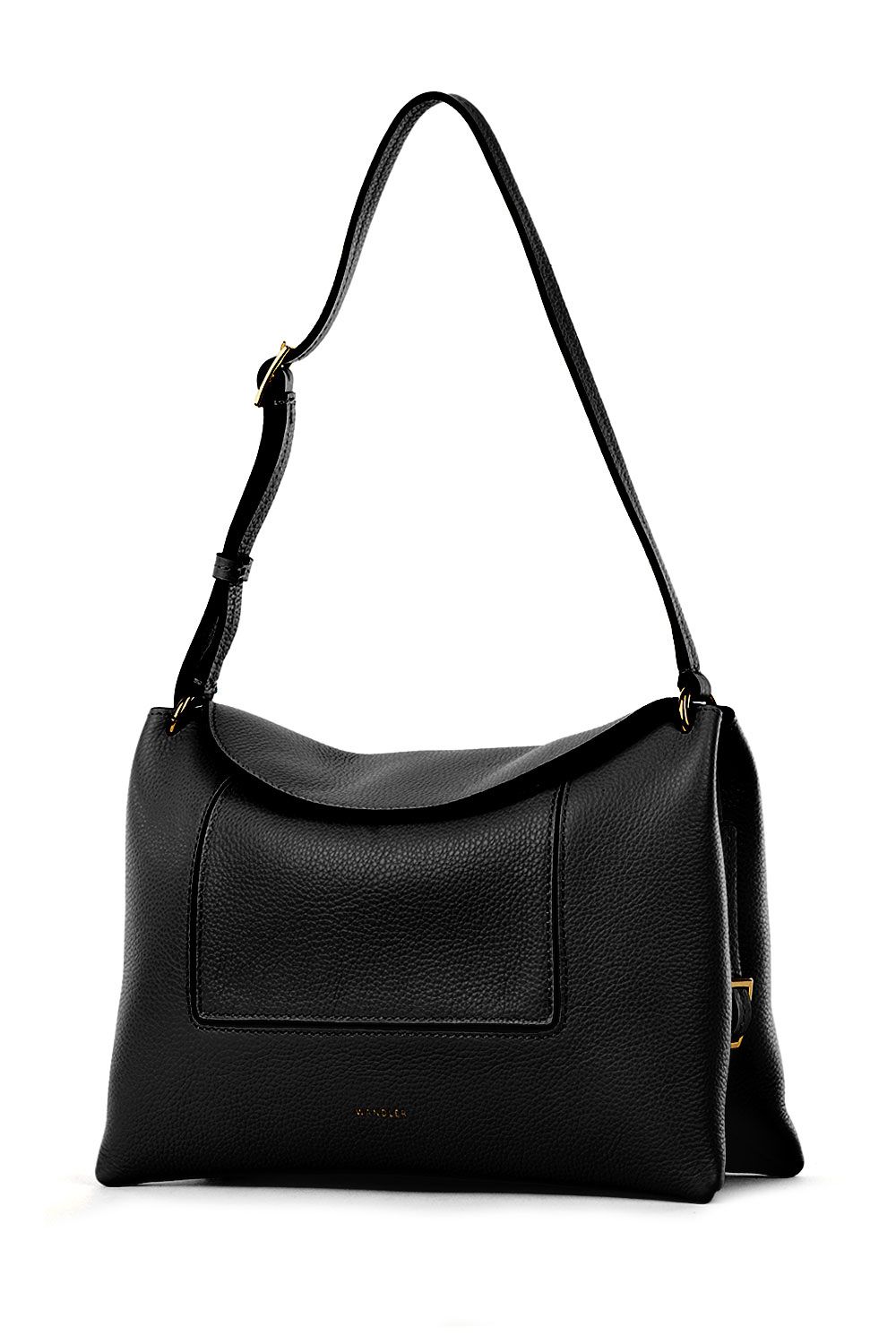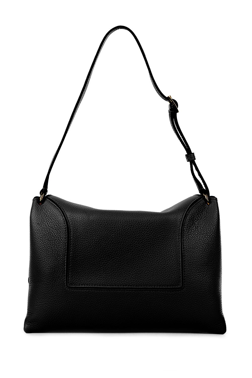 Borsa a spalla in pelle martellata nera, chiusura con patta e due bottoni magnetici, unico scomparto interno in suede, unico manico in pelle regolabile fino a tracolla e piccolo logo frontale stampato oro