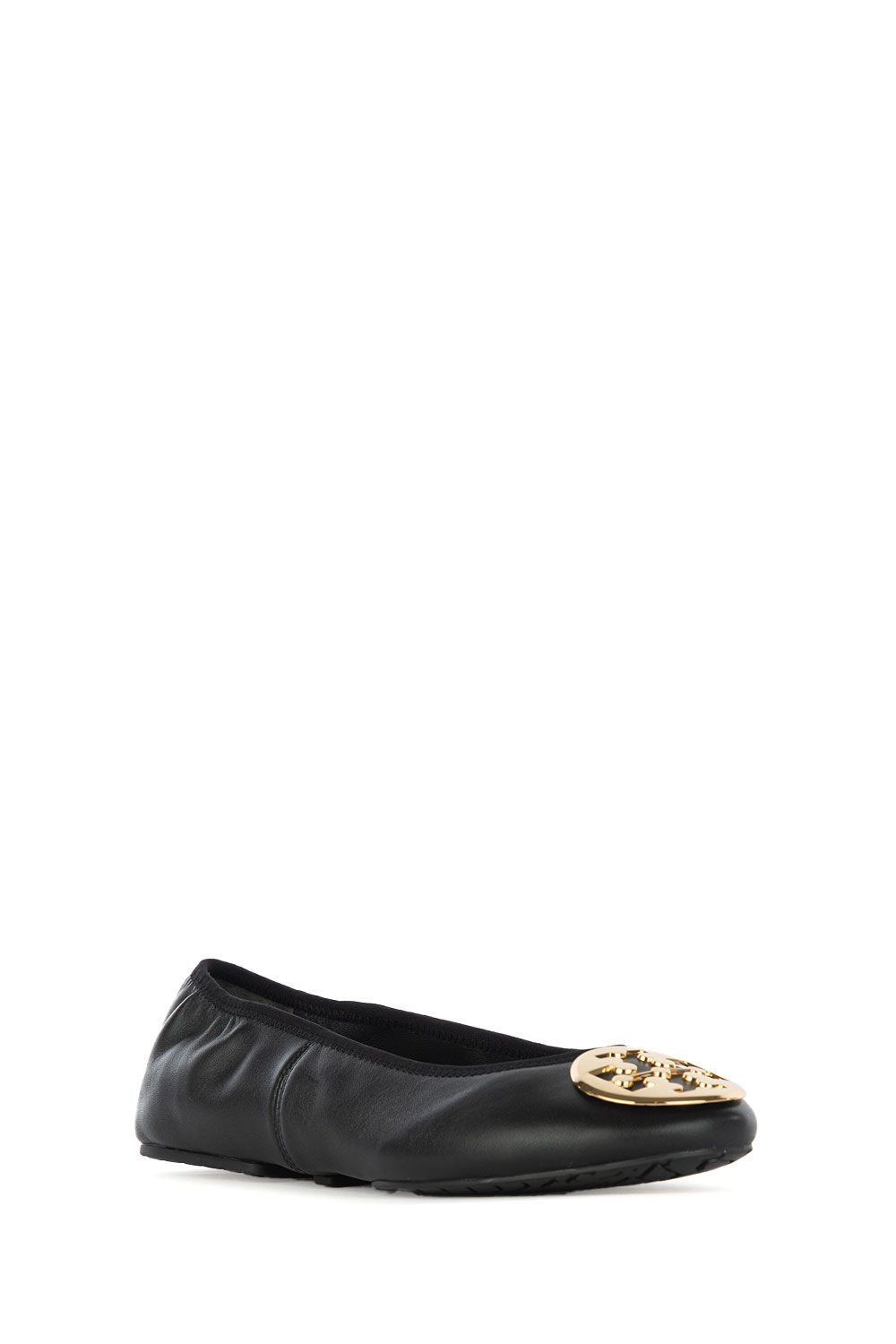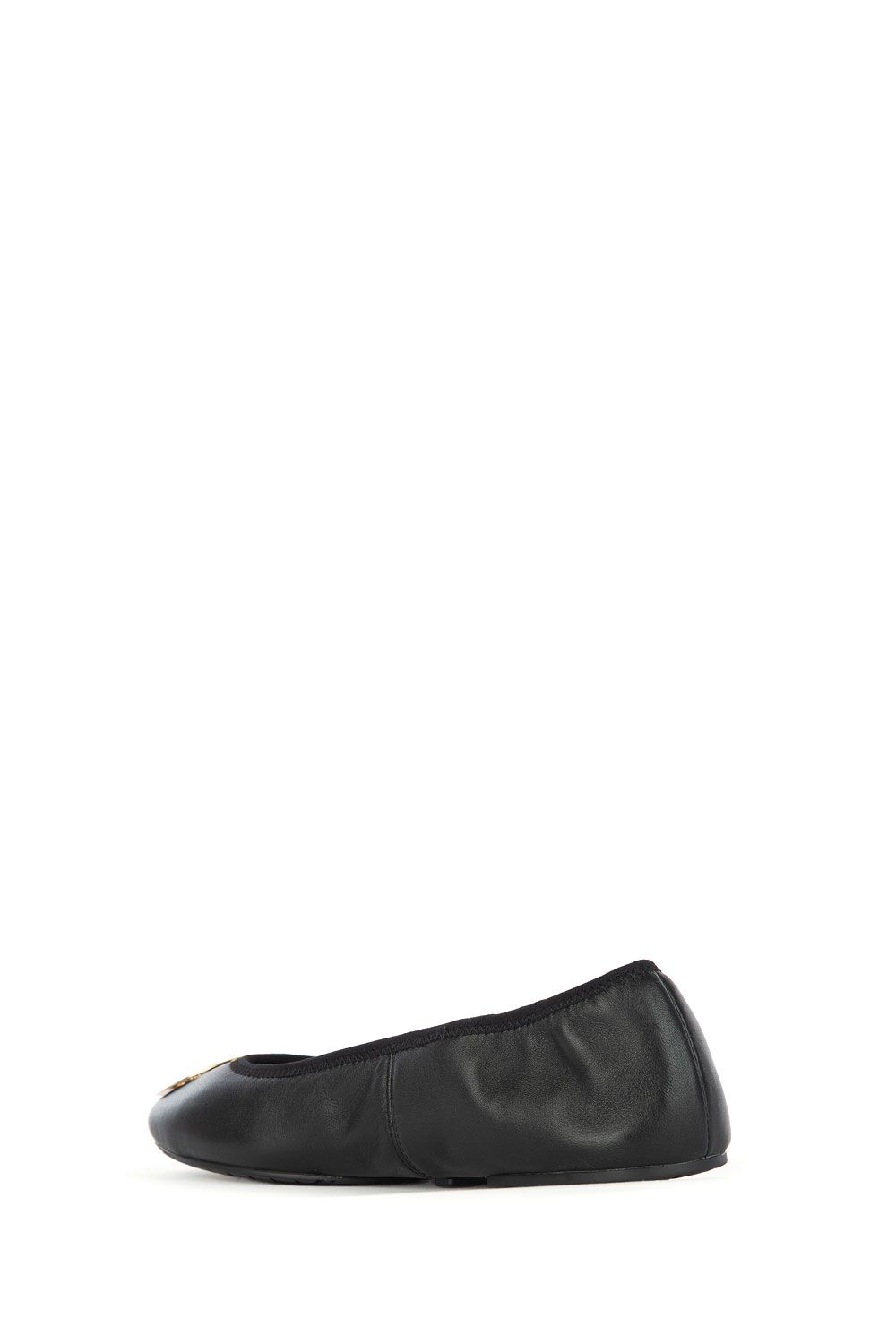 Ballerine in pelle nera con dettaglio in metallo dorato con logo nella parte frontale e suola in gomma pieghevole