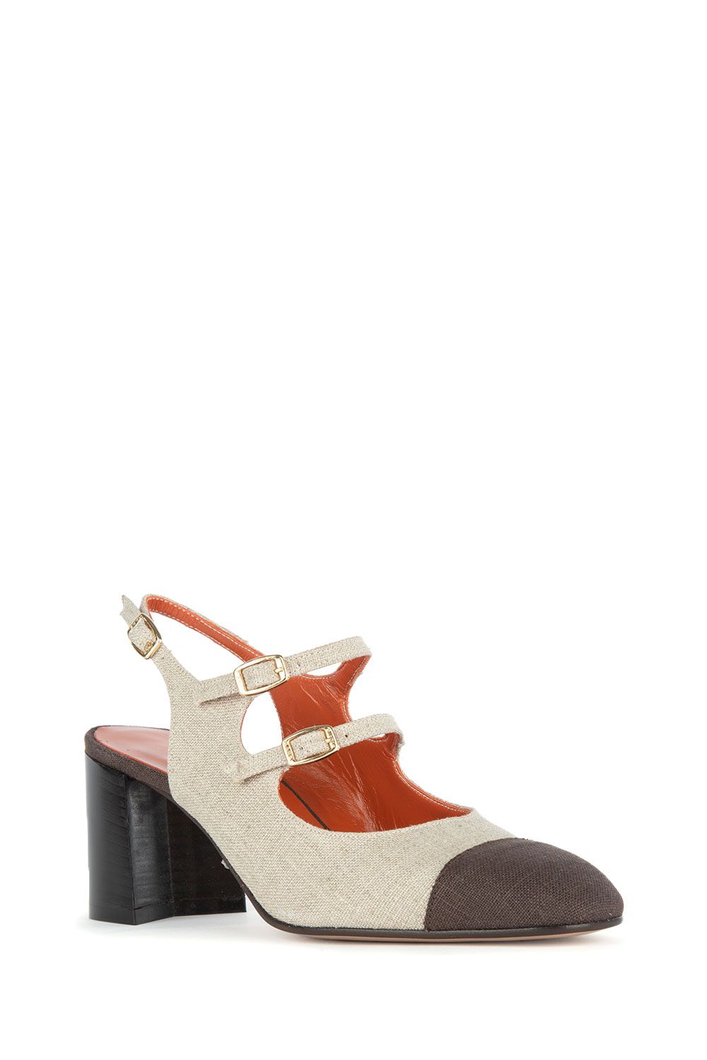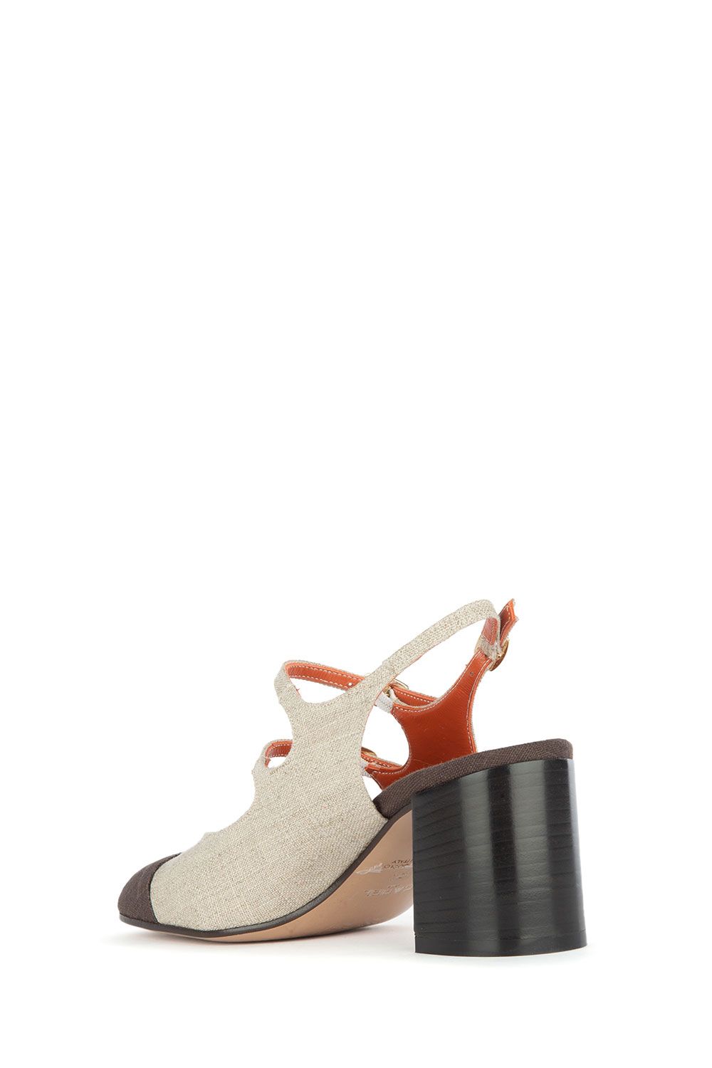 Slingaback in canvas bicolore sabbia e cioccolato con doppi cinturi regolabili e tacco di altezza 60mm