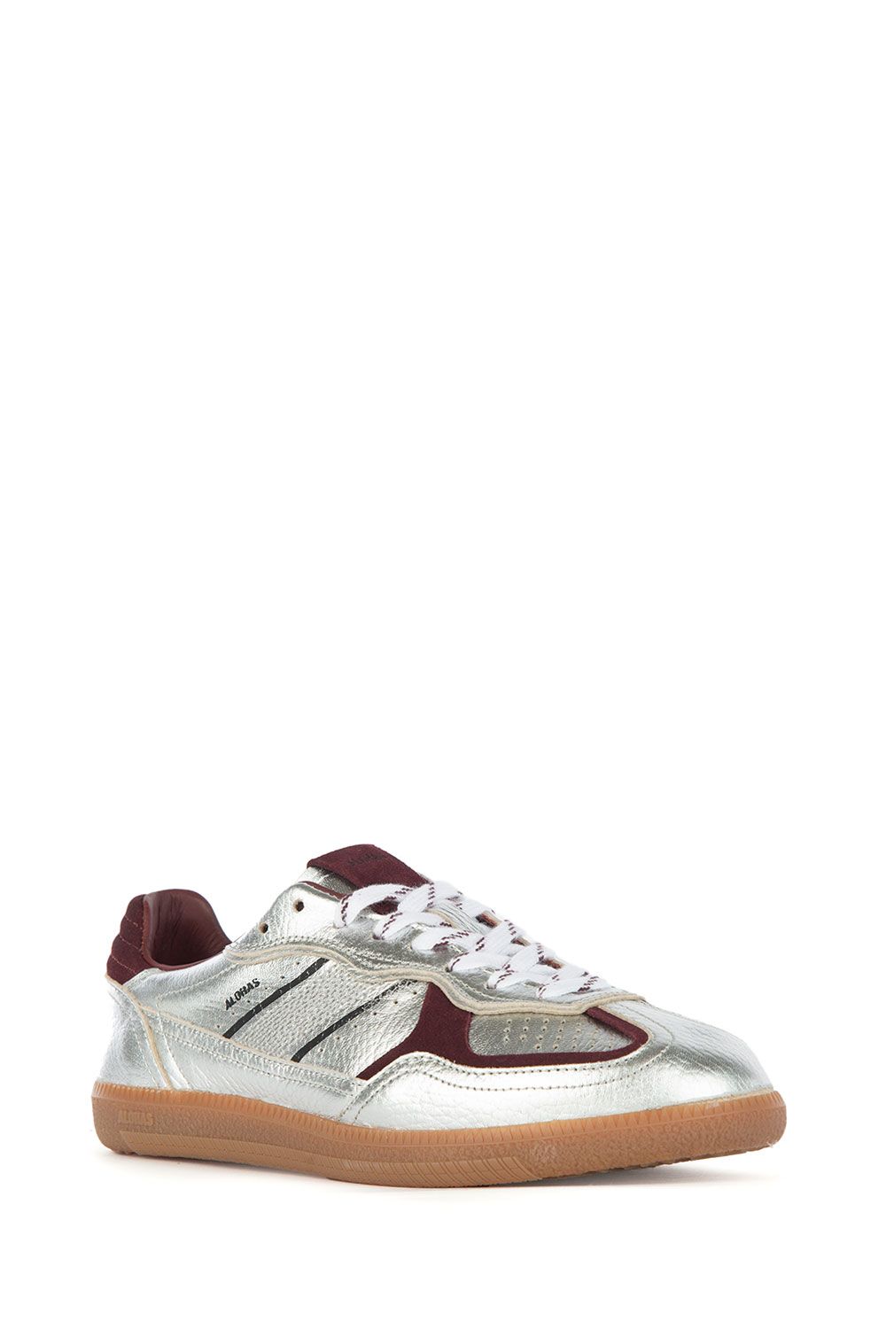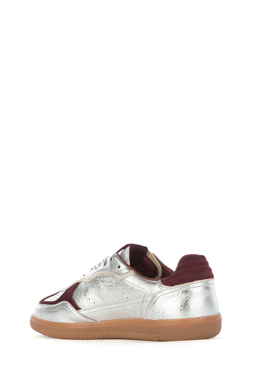 Sneakers in pelle laminata argento con inserti in suede burgundy