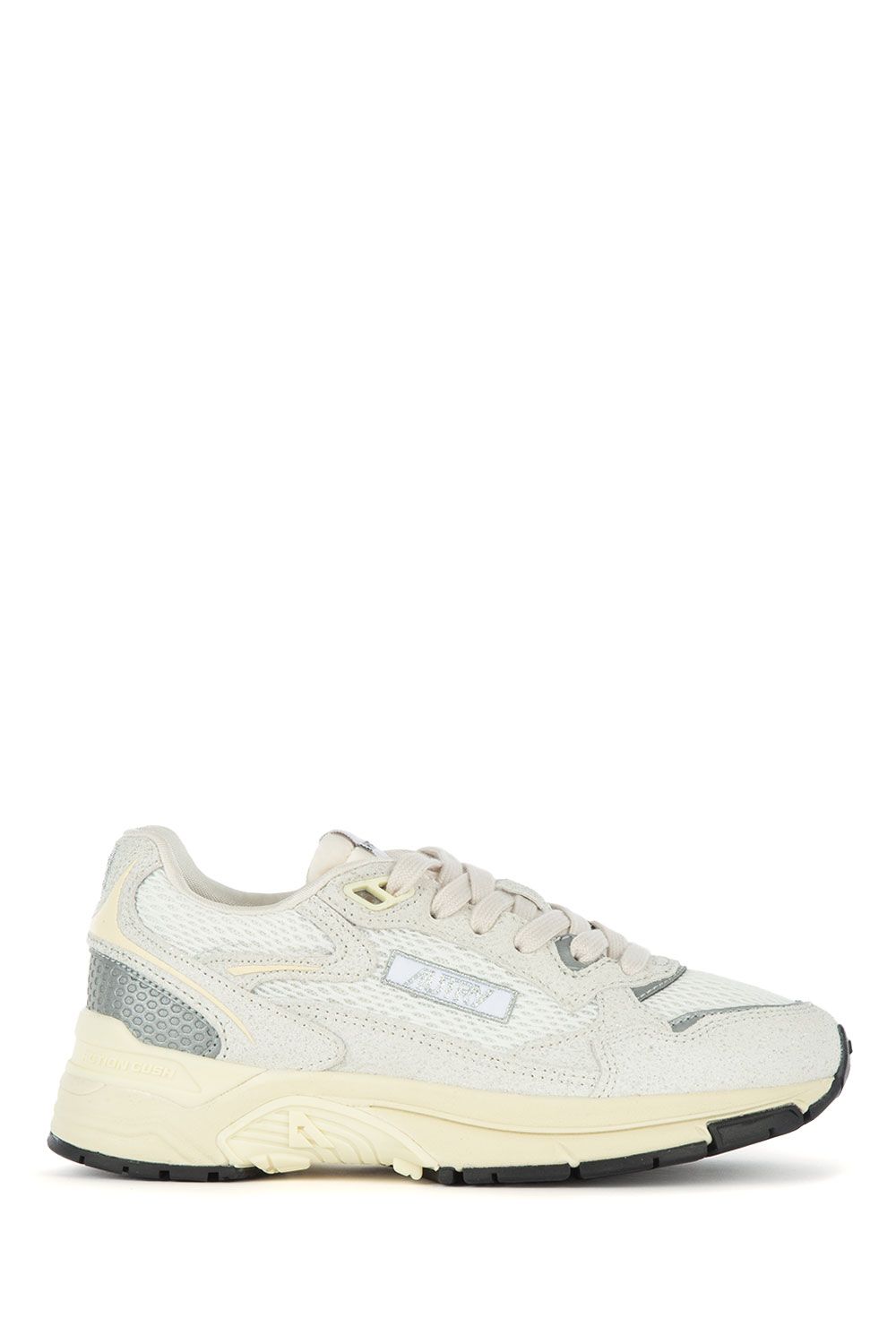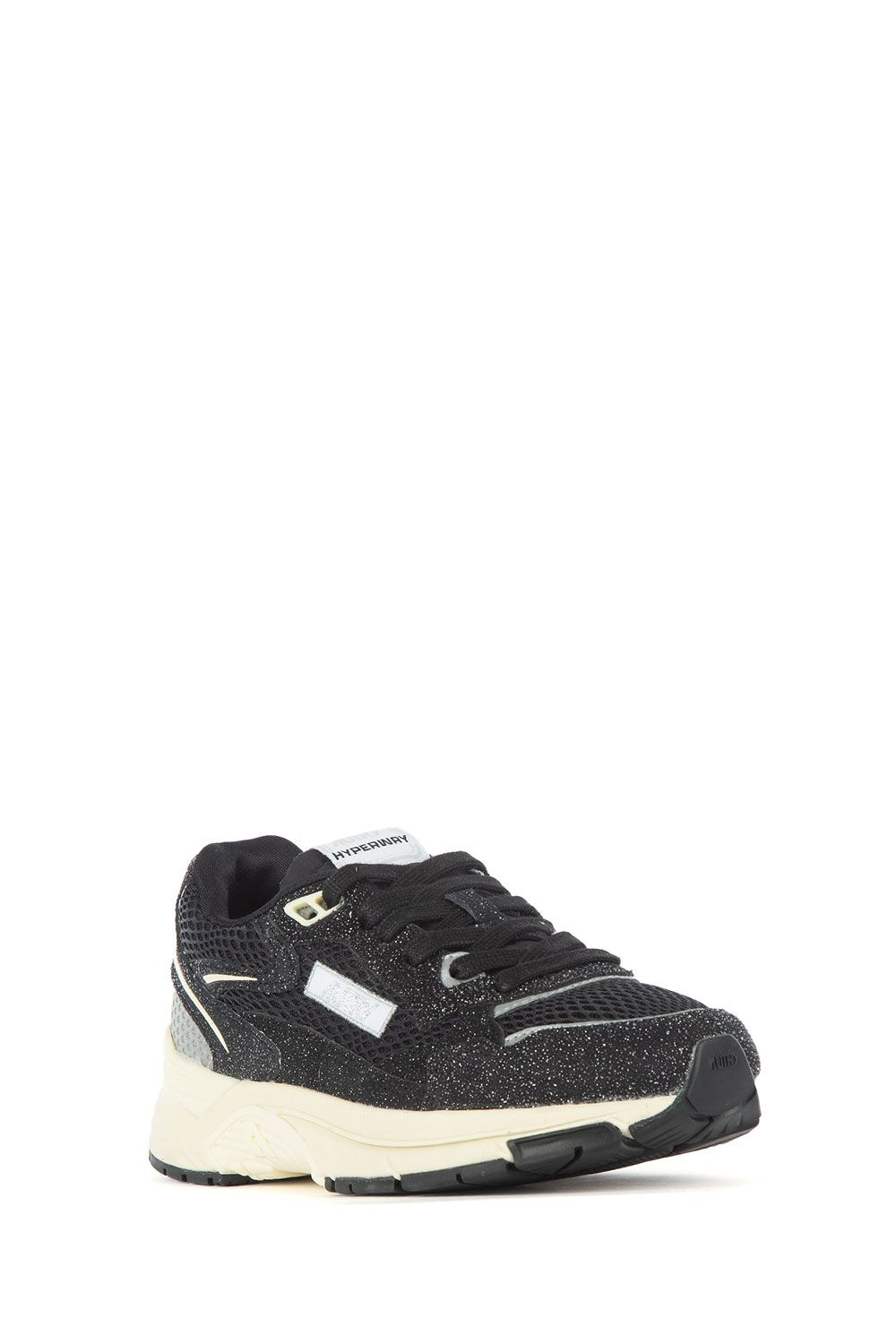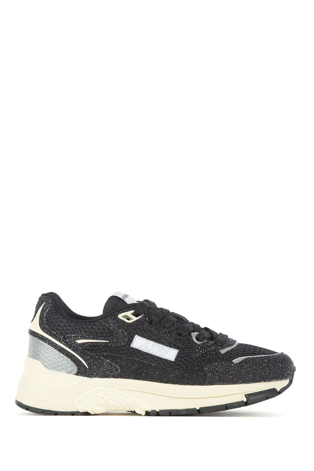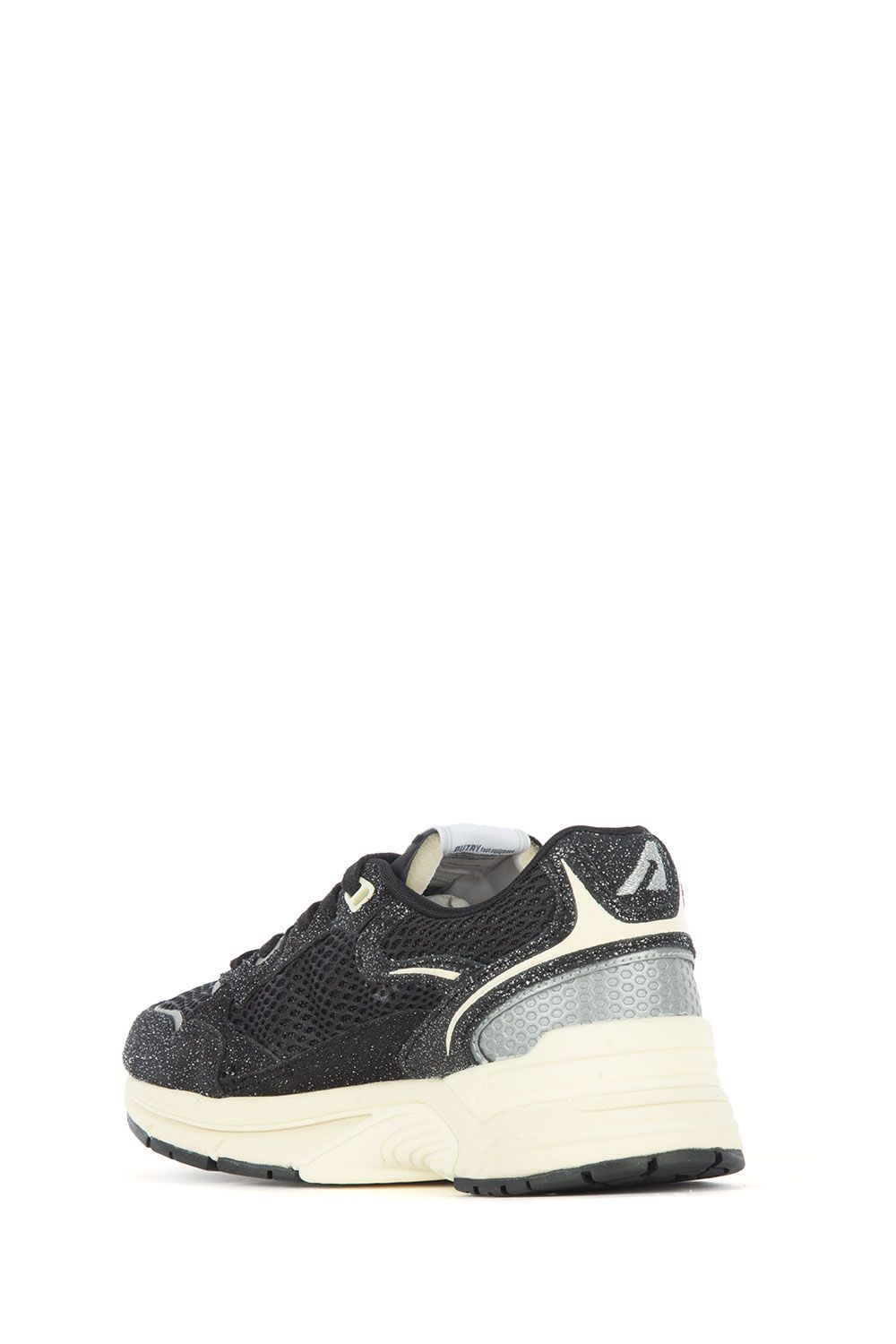 Sneakers in tessuto tecnico e suede nero con inserti in lurex argento, talloncino con ricamo argento, linguetta con logo, stringhe bianche e suola in gomma