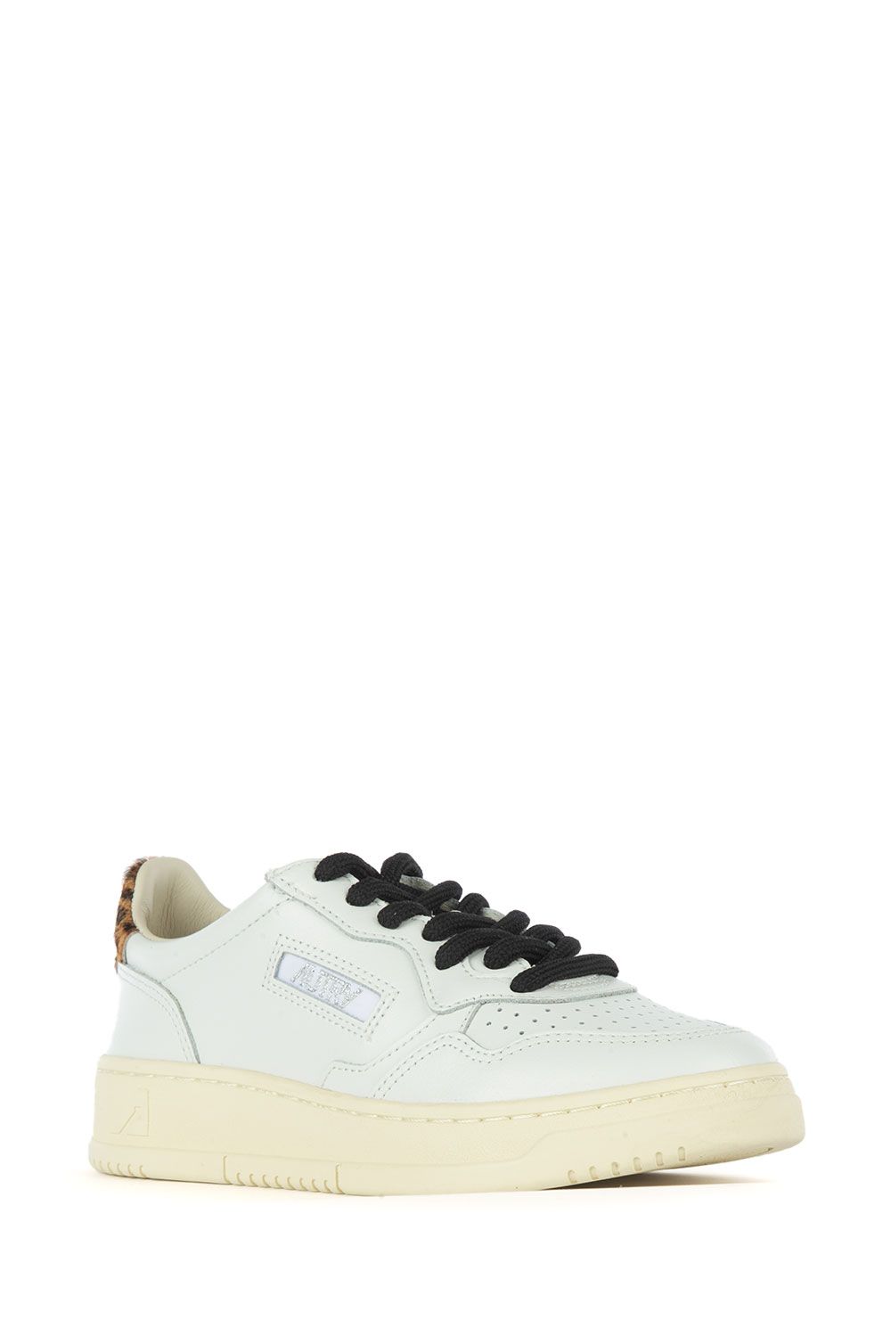 Sneakers in pelle bianca con talloncino in cavallino animalier con ricamo nero, linguetta con ricamo argento, stringhe tubolari nere e suola in gomma