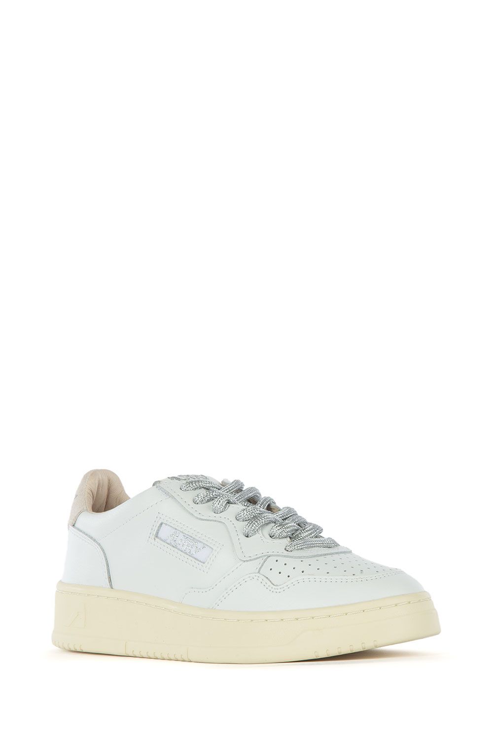 Sneakers in pelle bianca con talloncino in suede con ricamo argento, linguetta con ricamo argento, stringhe in lurex argento e suola in gomma