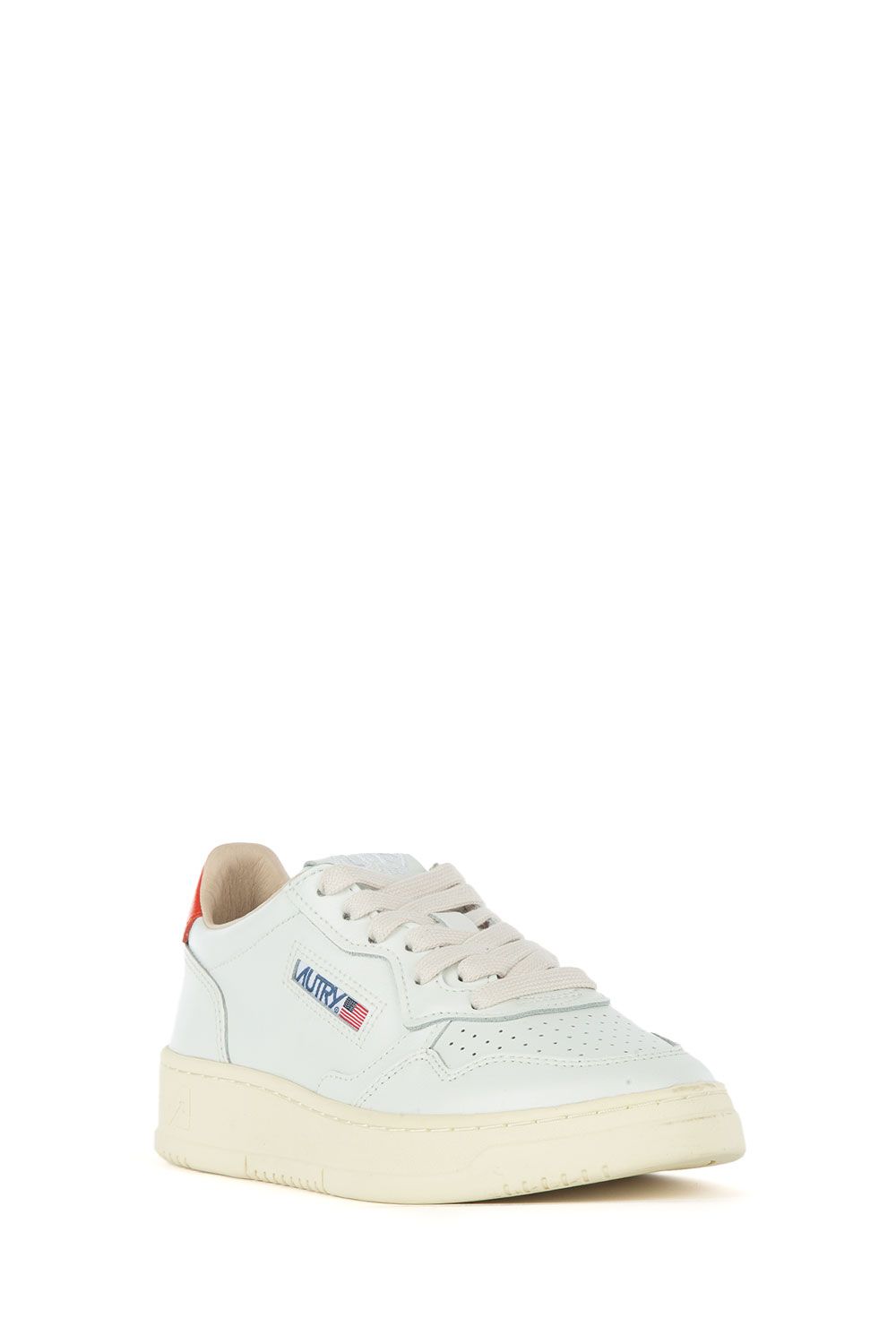 Sneakers in pelle bianca con talloncino in pelle rossa con logo, linguetta con ricamo tono su tono, stringhe bianche e suola in gomma