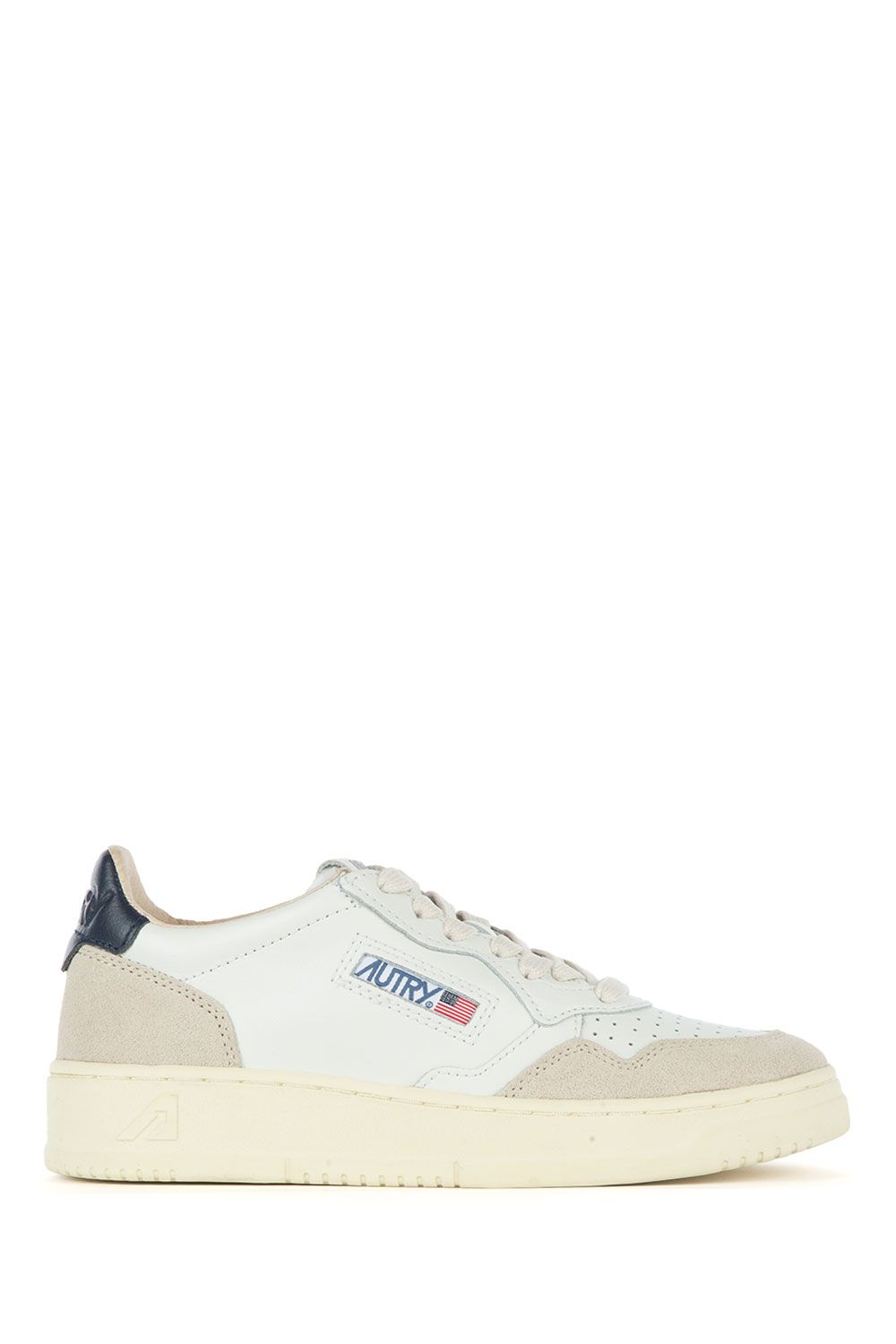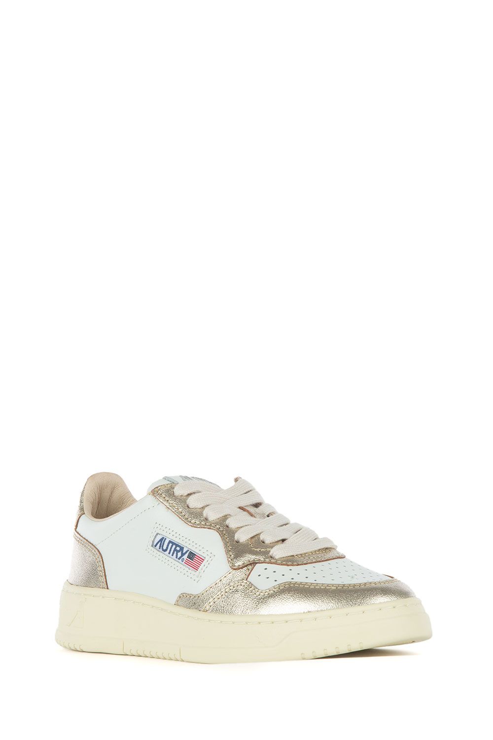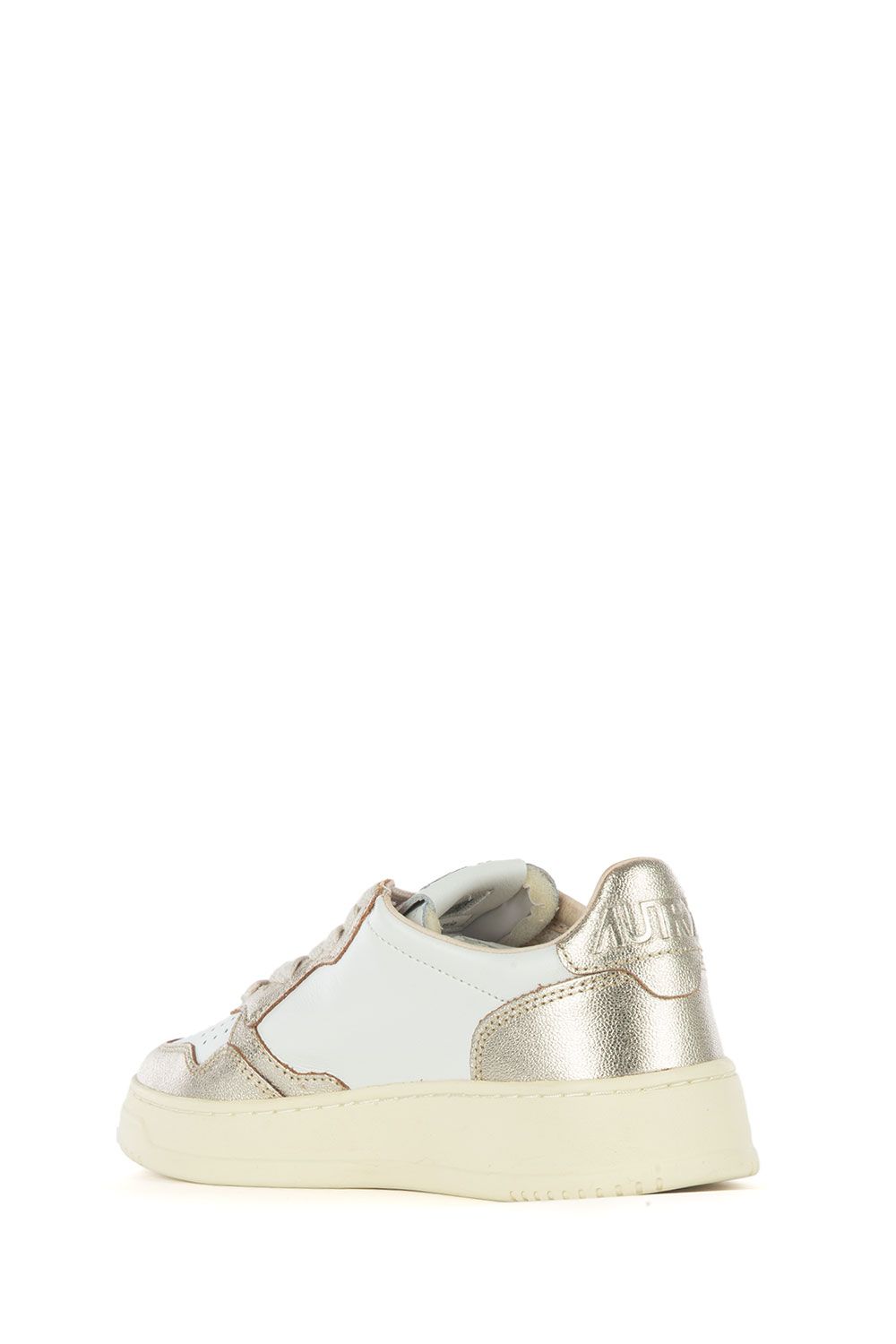 Sneakers in pelle bianca e platino, linguetta con ricamo argento, stringhe bianche e suola in gomma