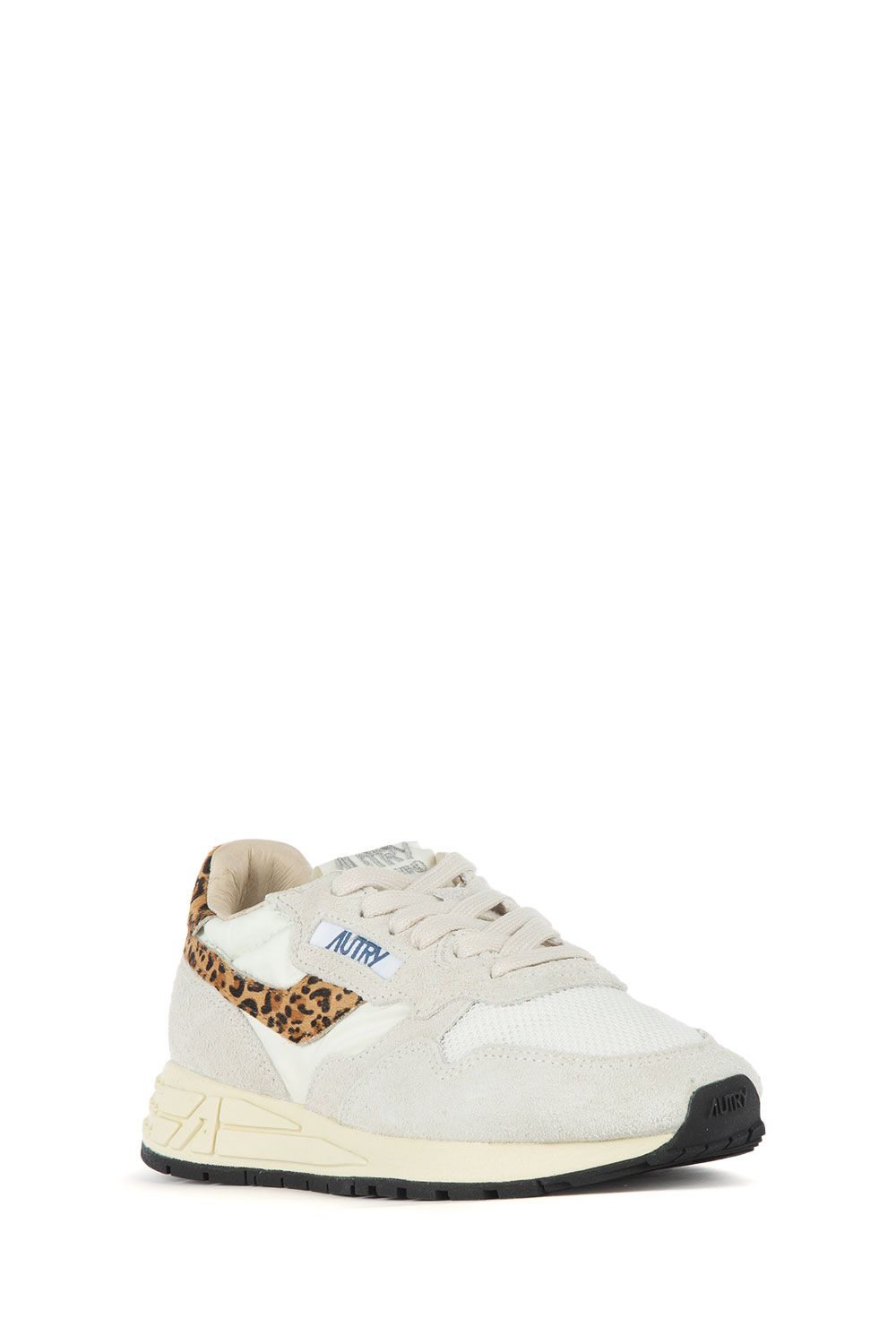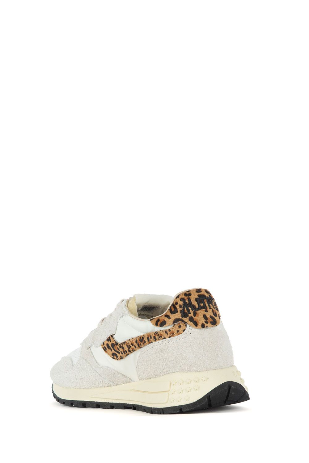 Sneakers in tessuto tecnico e suede bianco, inserto in cavallino animalier, talloncino in cavallino animalier con logo ricamato nero, linguetta con logo ricamato argento, stringhe bianche e suola in gomma