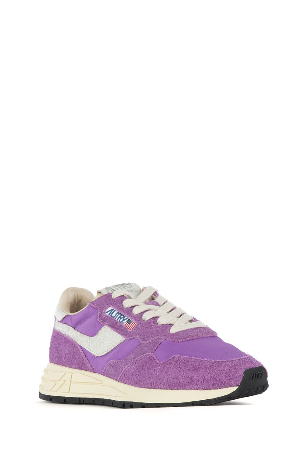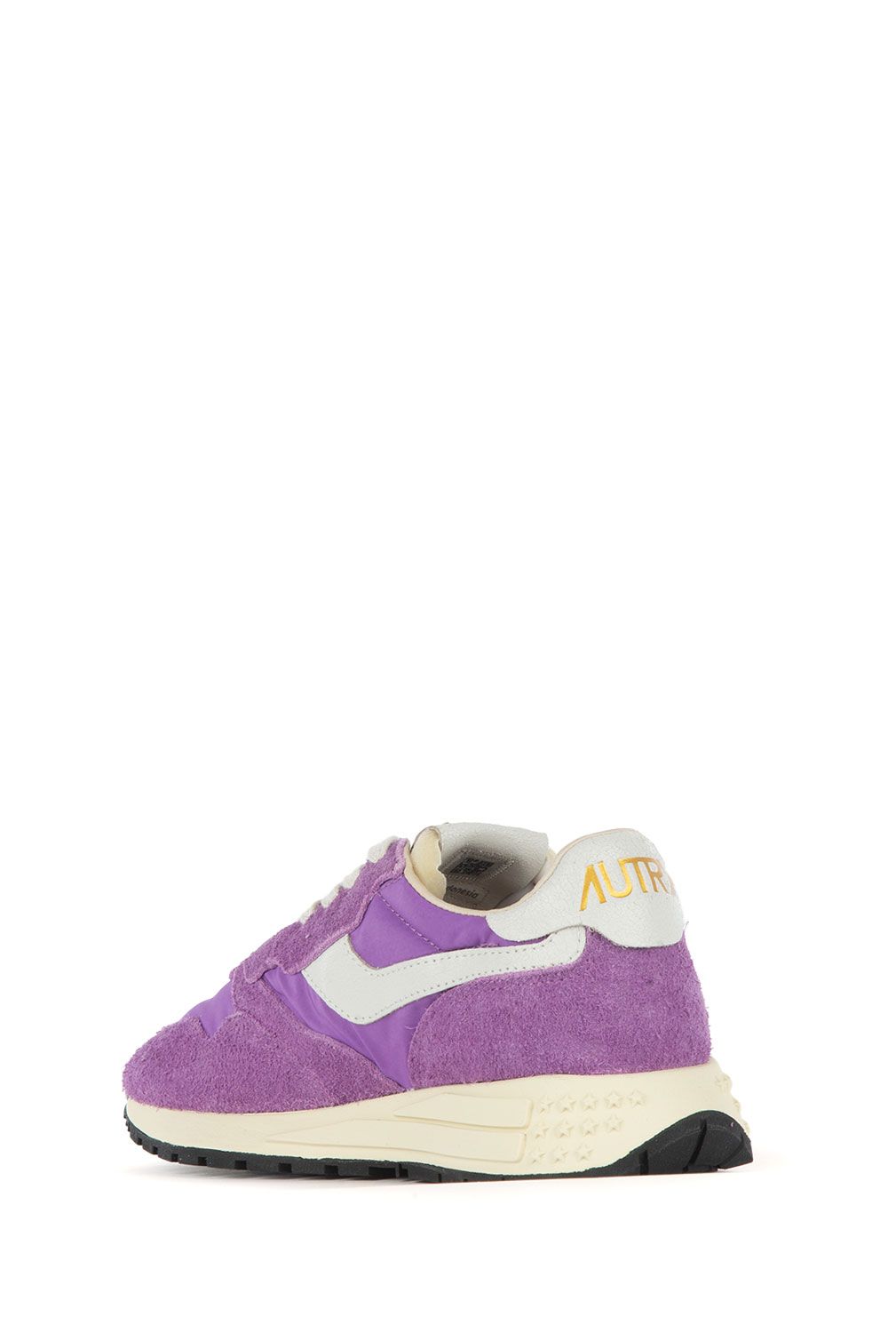 Sneakers in tessuto tecnico e suede viola, inserto in pelle bianca, talloncino in pelle bianca con logo oro, linguetta con logo ricamato argento, stringhe bianche e suola in gomma