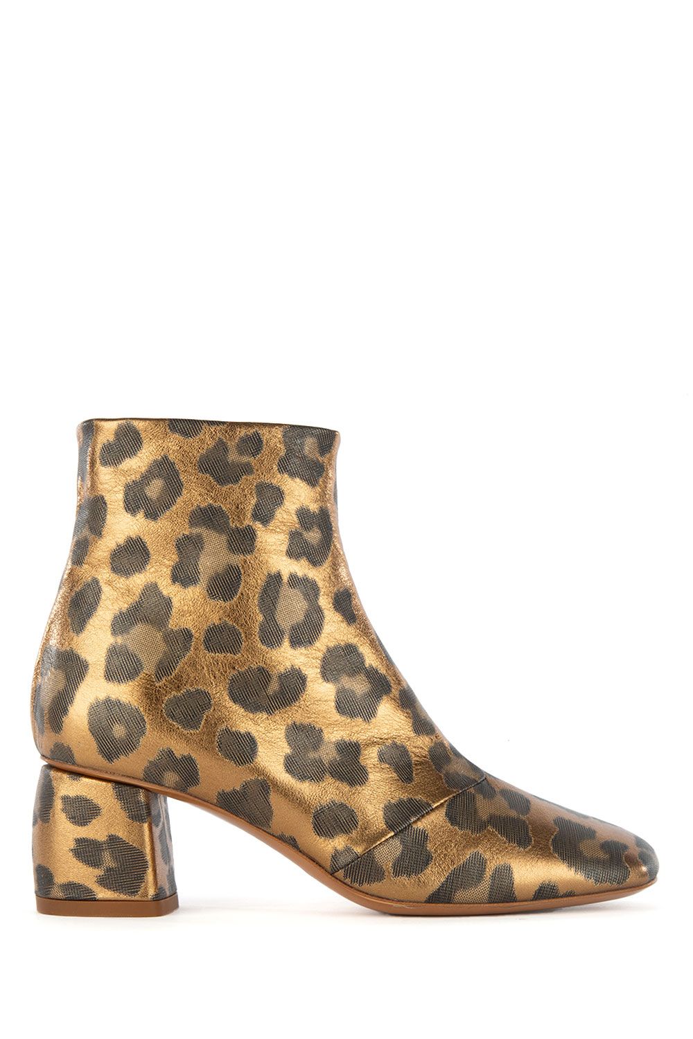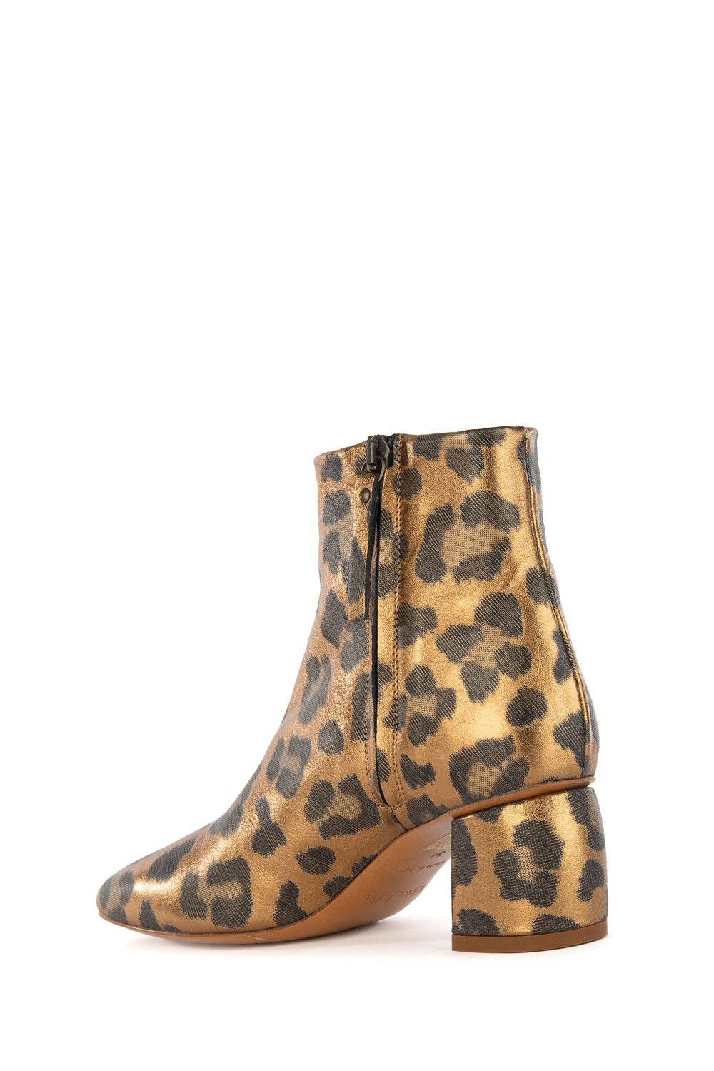 Stivaletti laminati in pelle fantasia animalier, punta tonda cucitura a vista frontale e laterale, chiusura con zip laterale tacco 4 cm
