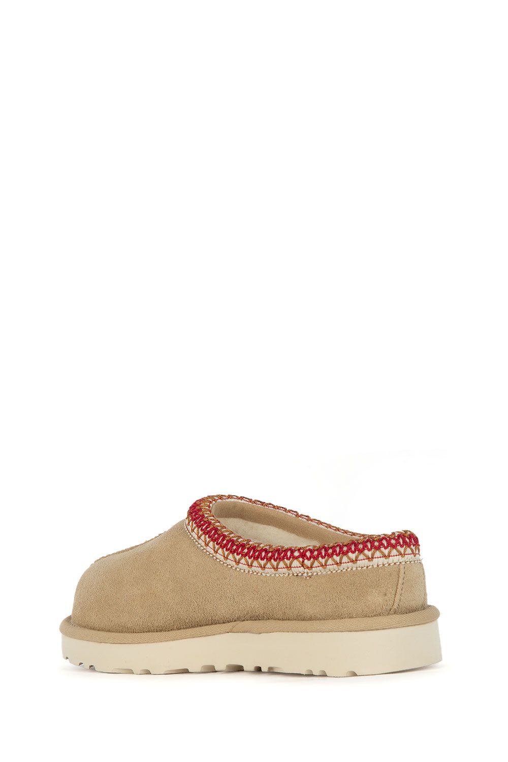 Mules in pelle scamosciata sabbia con interno in pelo, bordo ricamato a contrasto e suola in gomma